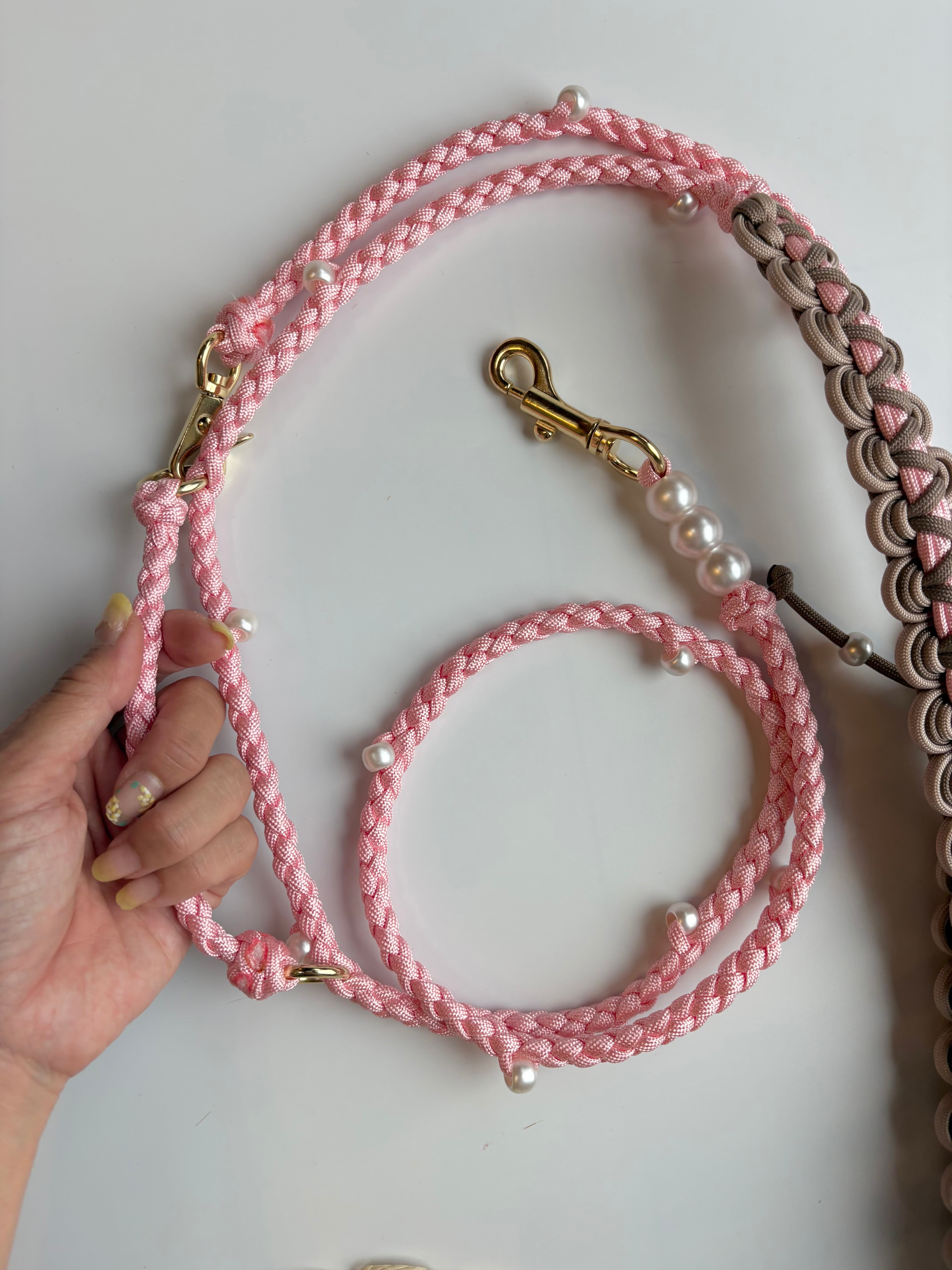 レバーナスカンを外してもう一つのマルカンに付け替えると、カフェリードの様に持ち手を変える事ができ、ロングリードとしても使用できます。
